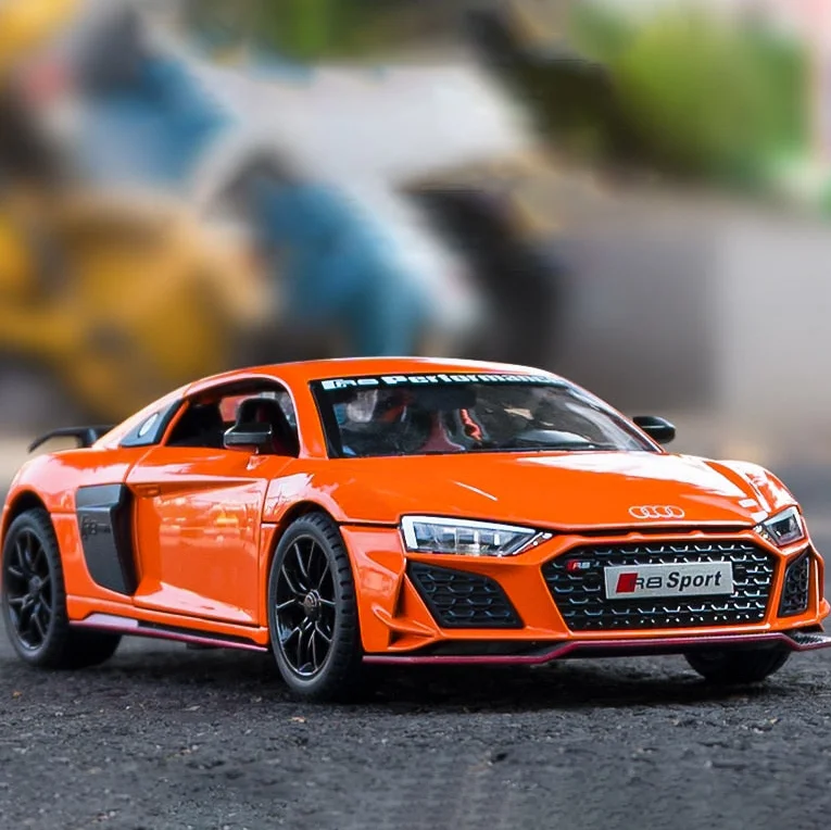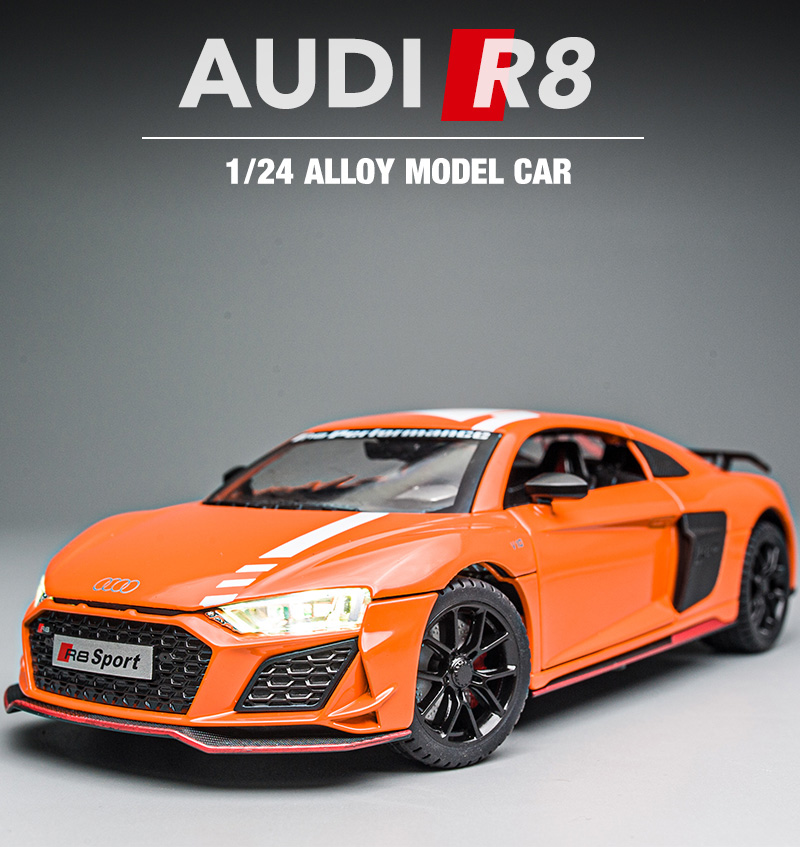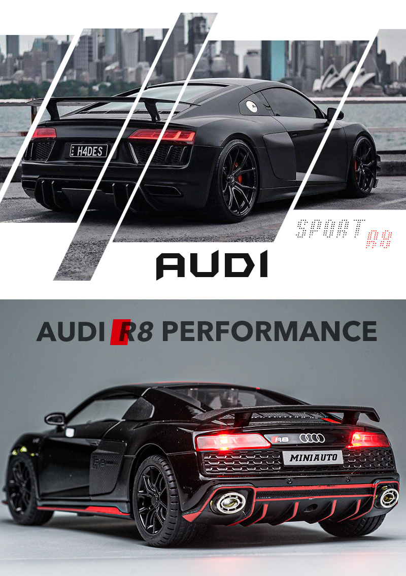 The model car is perfect for R8 V10 obsessed boys. Toy car opening doors and engine compartment, the model car has movable parts, lights and hood open to see the motor.