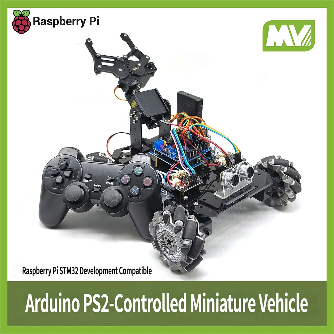 - PS2 controller remote control: 2.4G wireless connection, supports precise joystick control of the vehicle's movement and robotic arm actions.