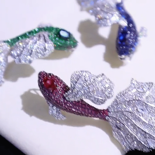 Embellishment materials are synthetic cubic zirconia, synthetic rubies, and synthetic emeralds