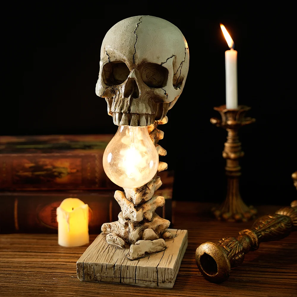 This desk lamp features a skull as its central design element, creating a striking and unique design. The skull's head features realistic details and a natural cracked effect, evoking the appearance of a time-worn skull, exuding a mysterious and vintage aura. Connecting the skull to the base are sections that mimic the structure of a vertebra, with distinct grain and a rough texture, perfectly complementing the skull, creating a uniquely dark, gothic style. The accompanying bulb is a classic spherical shape. When lit, soft light filters through the skull's mouth, creating a play of light and shadow that adds an eerie yet captivating atmosphere. The base is crafted from distressed wood, with visible grain and wear marks on the surface, further enhancing the vintage feel and complementing the overall design.