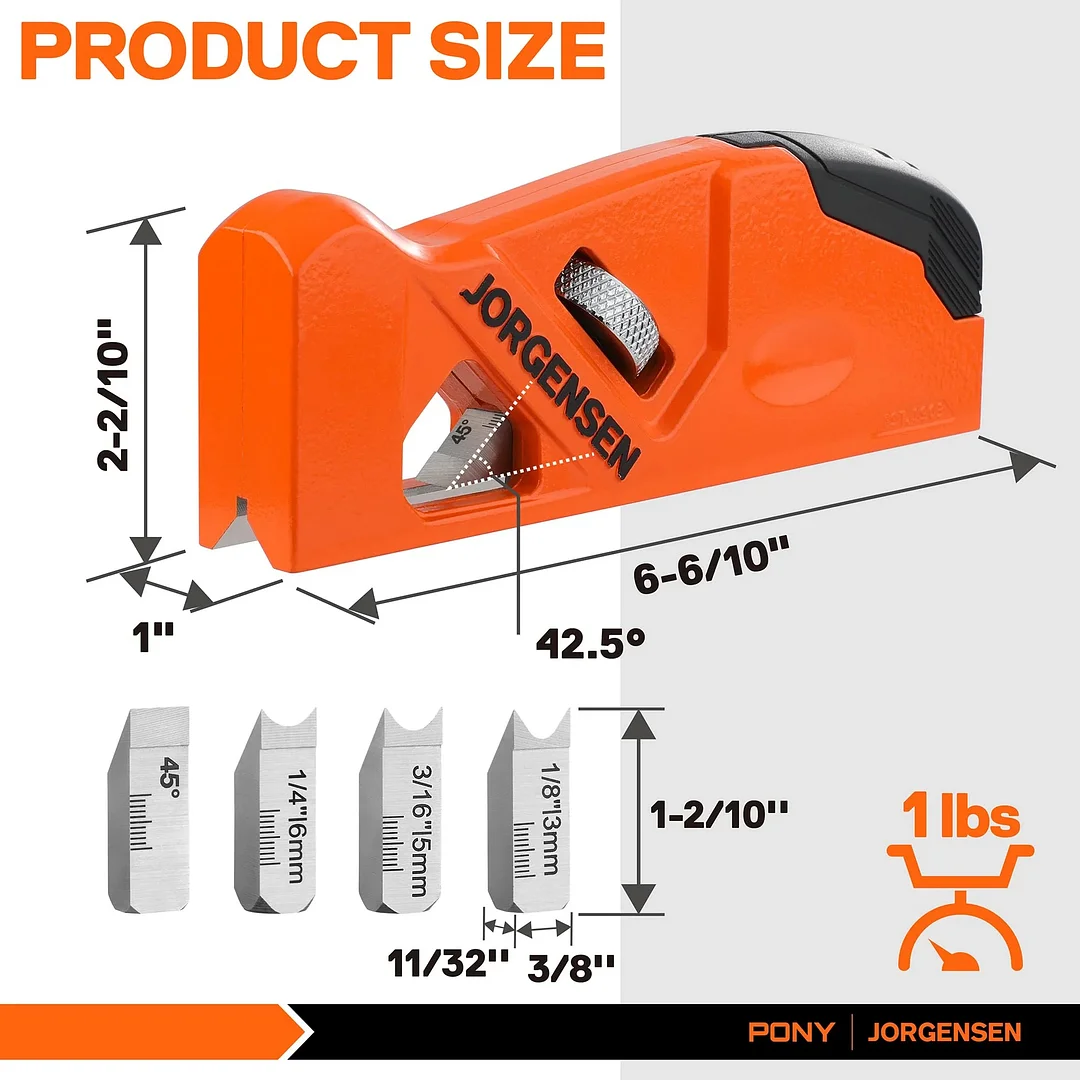 Details: JORGENSEN chamfer plane comes with four different shaped blades for basic woodworking tasks. The blade storage space, the polished bottom design and the appearance with curves are the advantages of this product, which is perfect for professional woodworkers and beginners.