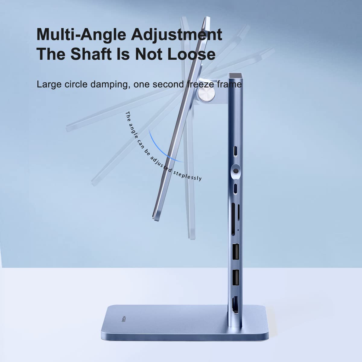 Foldable and Adjustable Multi-Angle This foldable desktop iPad stand has two hinges, the top axis is adjustable for angle, allowing you to easily adjust vertical and horizontal modes, and the bottom axis is steplessly adjustable for angle. You can easily adjust the optimal eye level to maintain a comfortable posture while drawing, taking notes, playing games, watching videos/photos