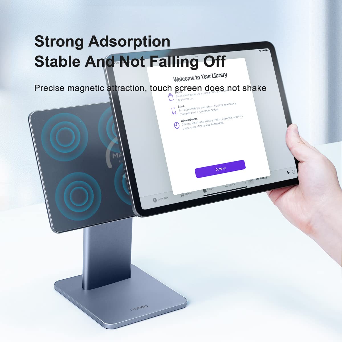 Magnetic IPAD Stand Hagibis Foldable Magnetic iPad Stand is made of high-quality aluminum alloy, equipped with a thicker and larger base and center of gravity design, as well as strong magnetic suction cups and all-round anti-slip rubber protection to ensure safety and no shaking.