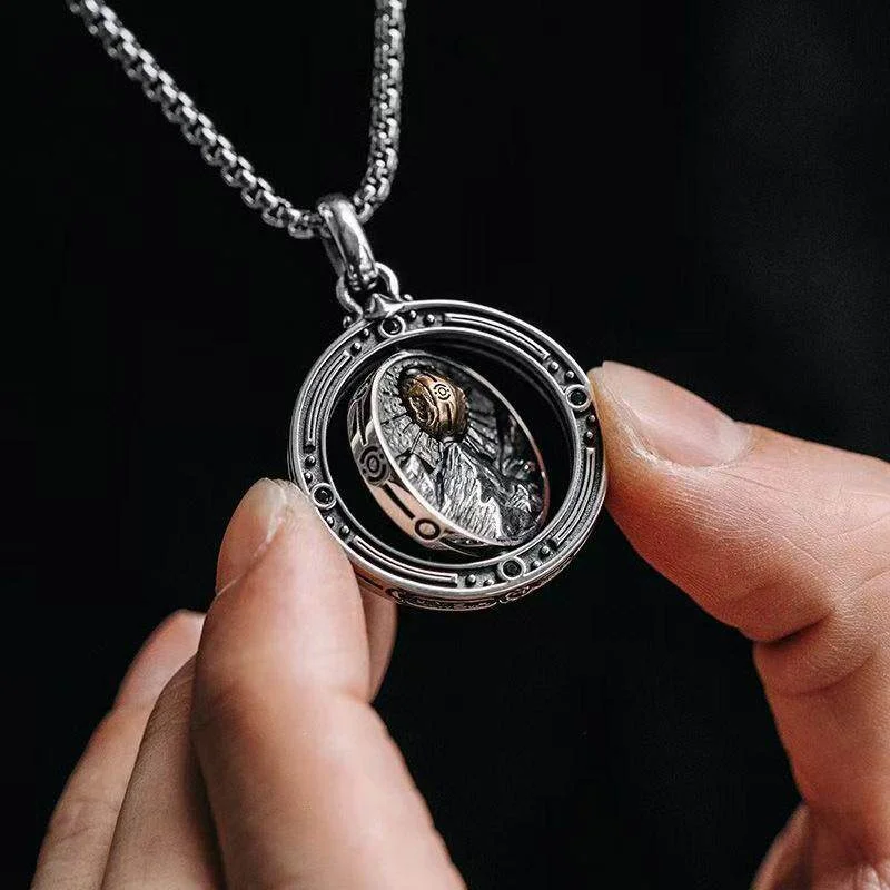 - The pendant's edge is engraved with retro geometric patterns, echoing the central mountain and sea relief, creating a harmonious and unified design.