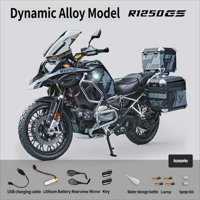 This is a highly detailed 1:7 scale dynamic die-cast model of the BMW R1250GS Adventure, featuring a highly realistic start-up mechanism, sound and light effects, and movable parts, making it a collector's item for motorcycle enthusiasts.